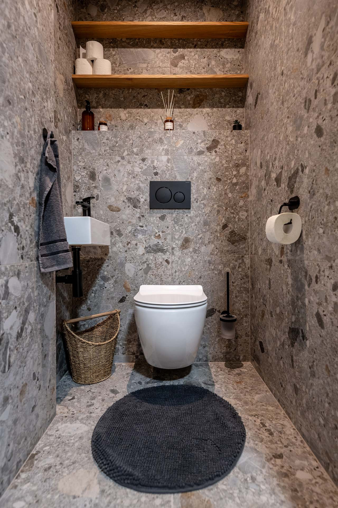 - Badezimmer mit Dusche, Doppelwaschbecken, WC und Haartrockner