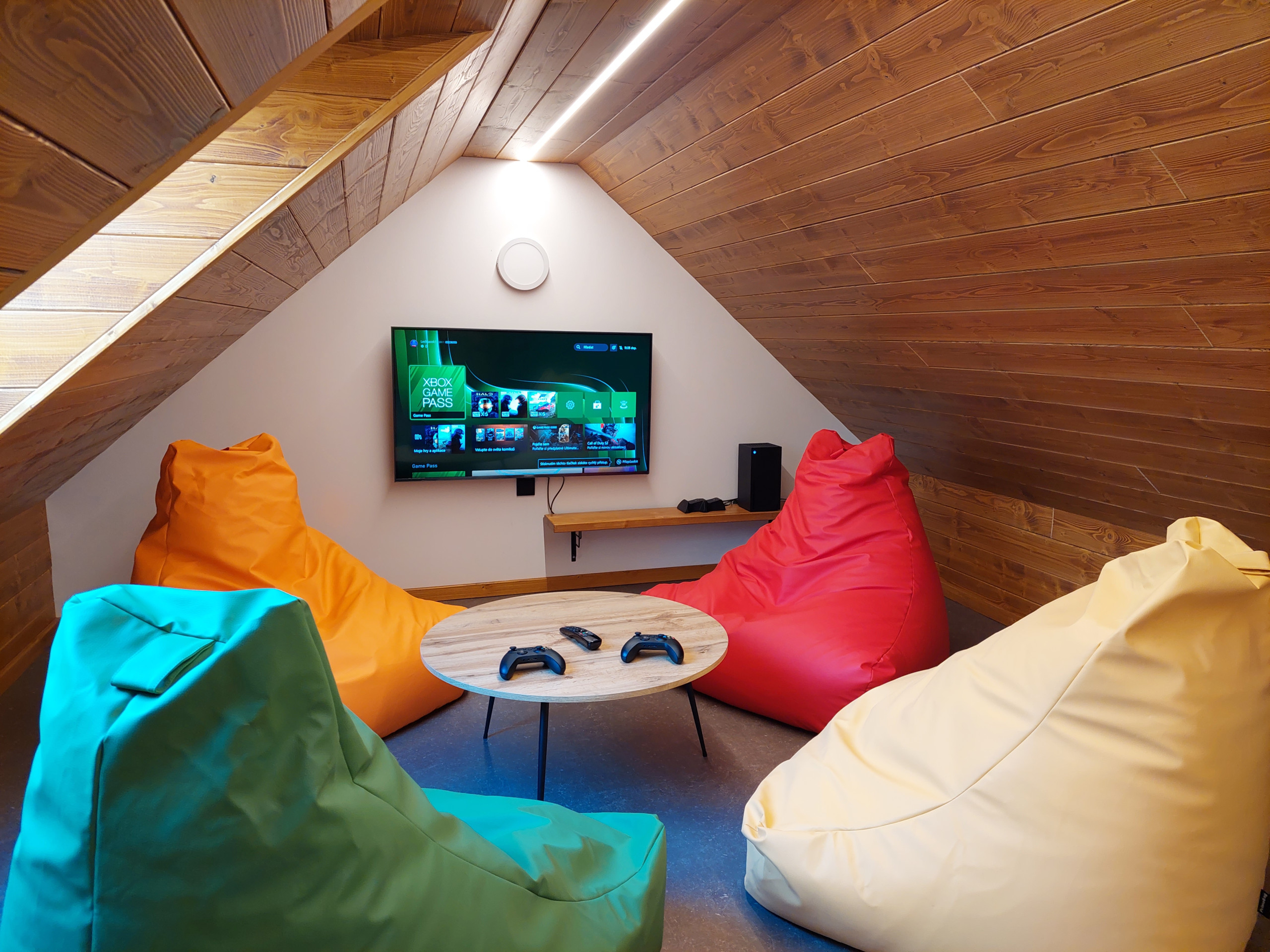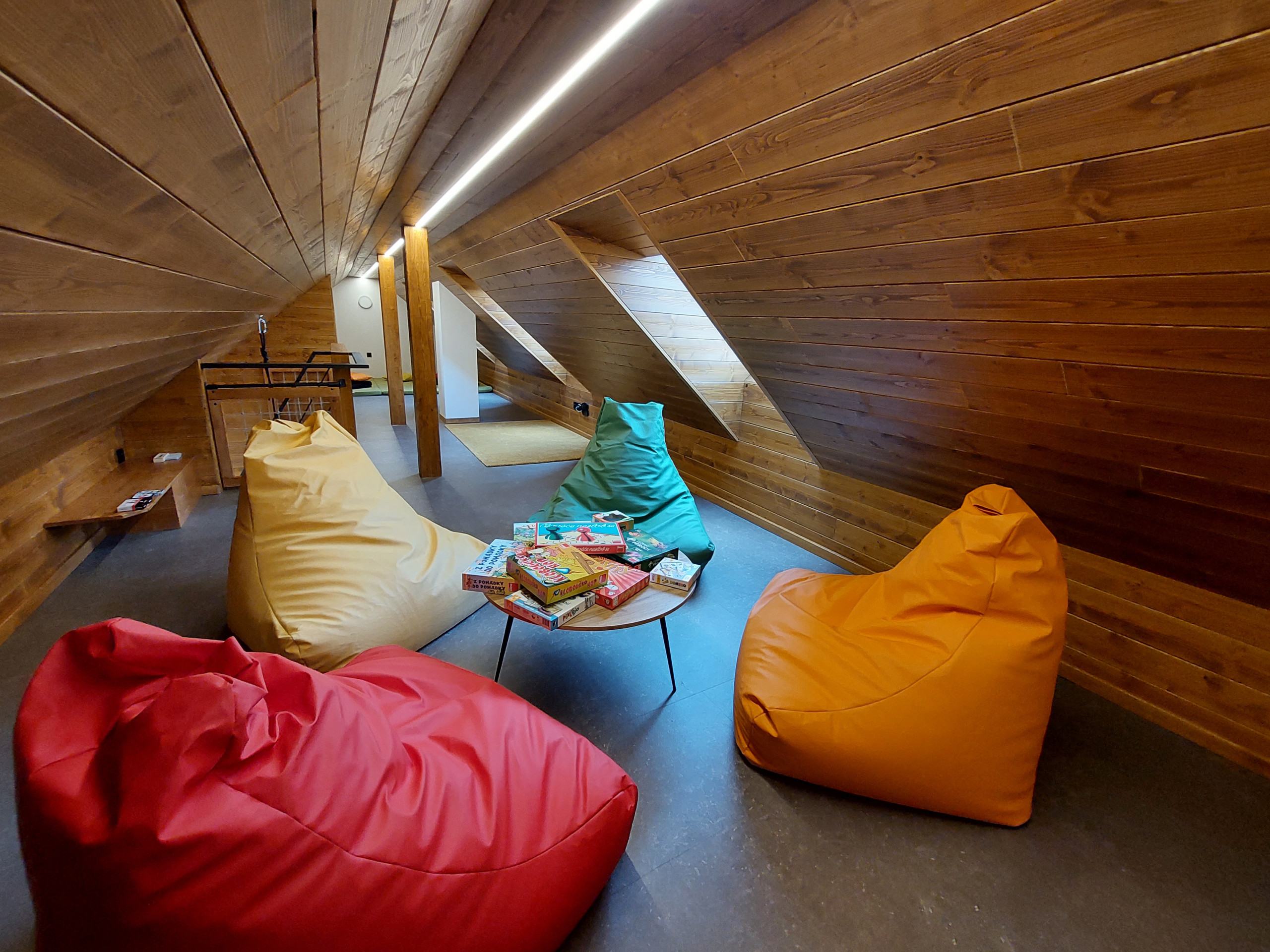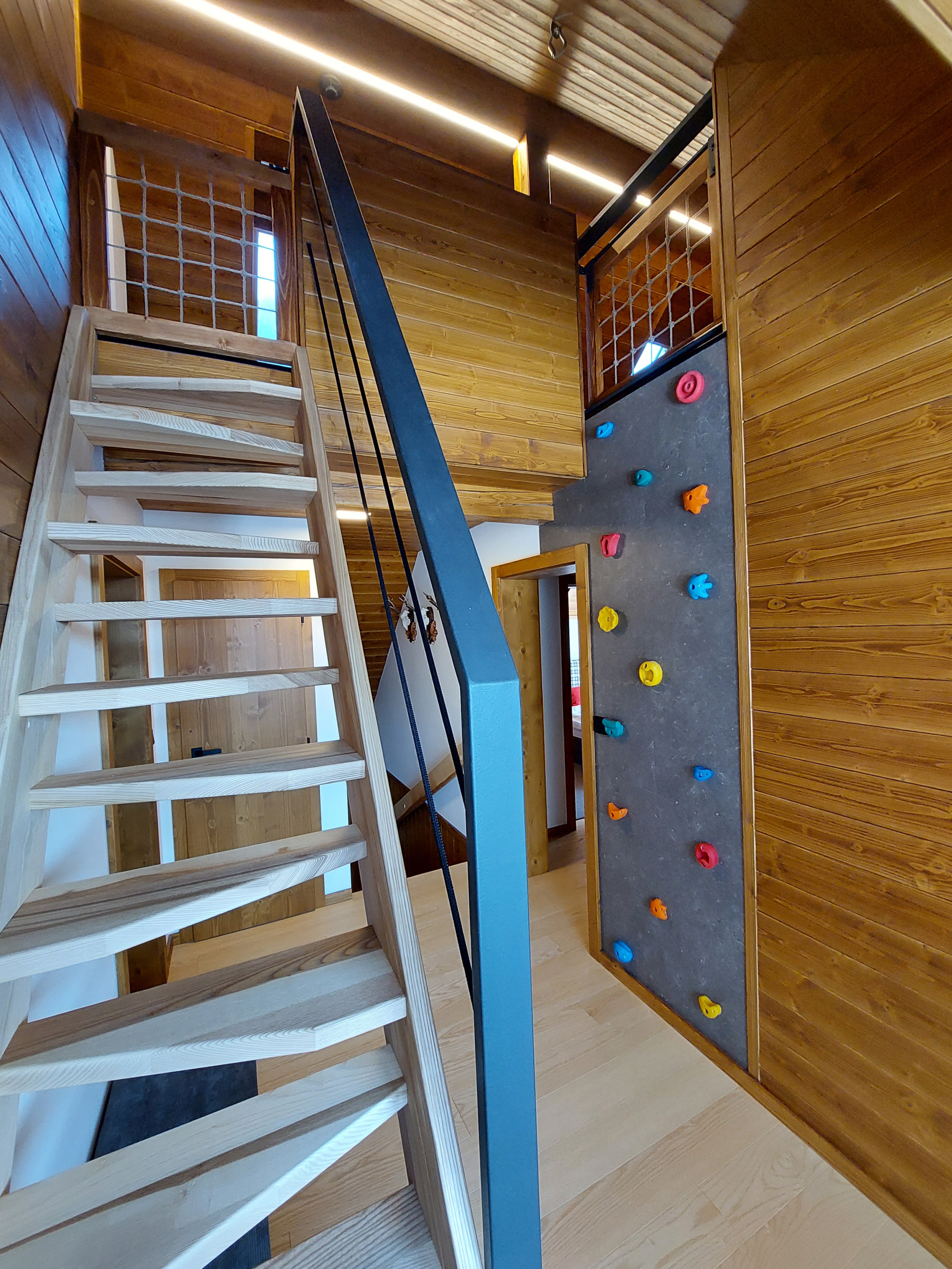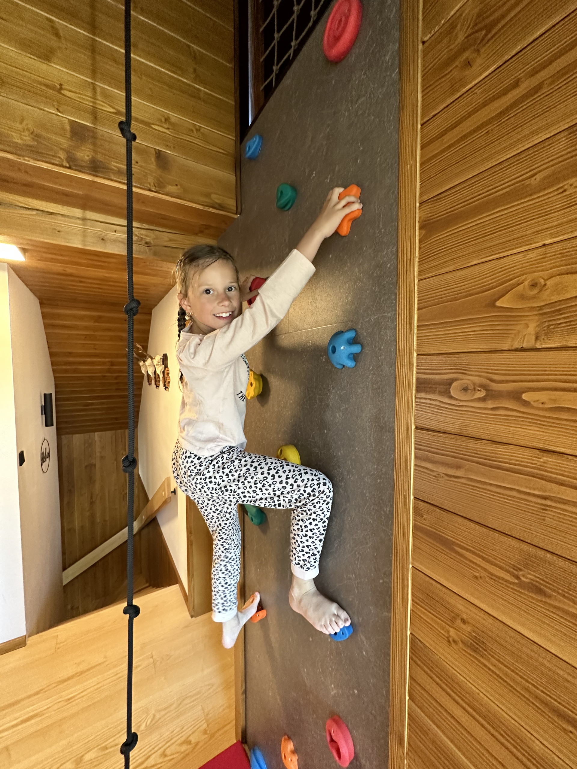 Der Dachboden wirkt fast wie ein eigenes Spielhaus: ein geräumiger Relax- und Spielbereich mit TV, Spielekonsole, Sitzsäcken und sogar einer Kletterwand, die nach oben führt. Kinder sind hier stundenlang beschäftigt, und ehrlich gesagt, auch Erwachsene haben ihren Spaß. Im Technikraum können Sie Ihre Wintersportkleidung, Skier und Skischuhe trocknen und für den nächsten Tag vorbereiten.