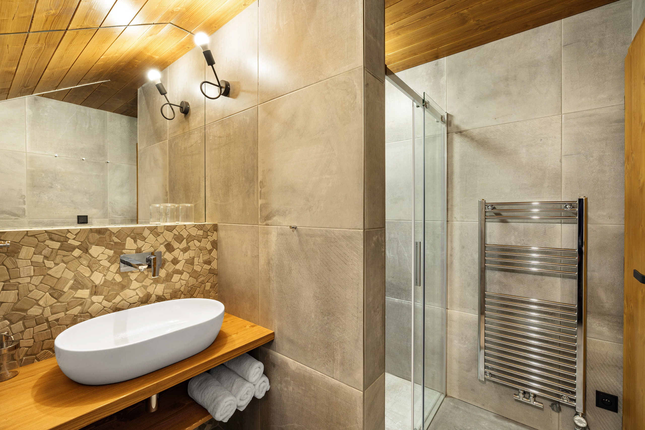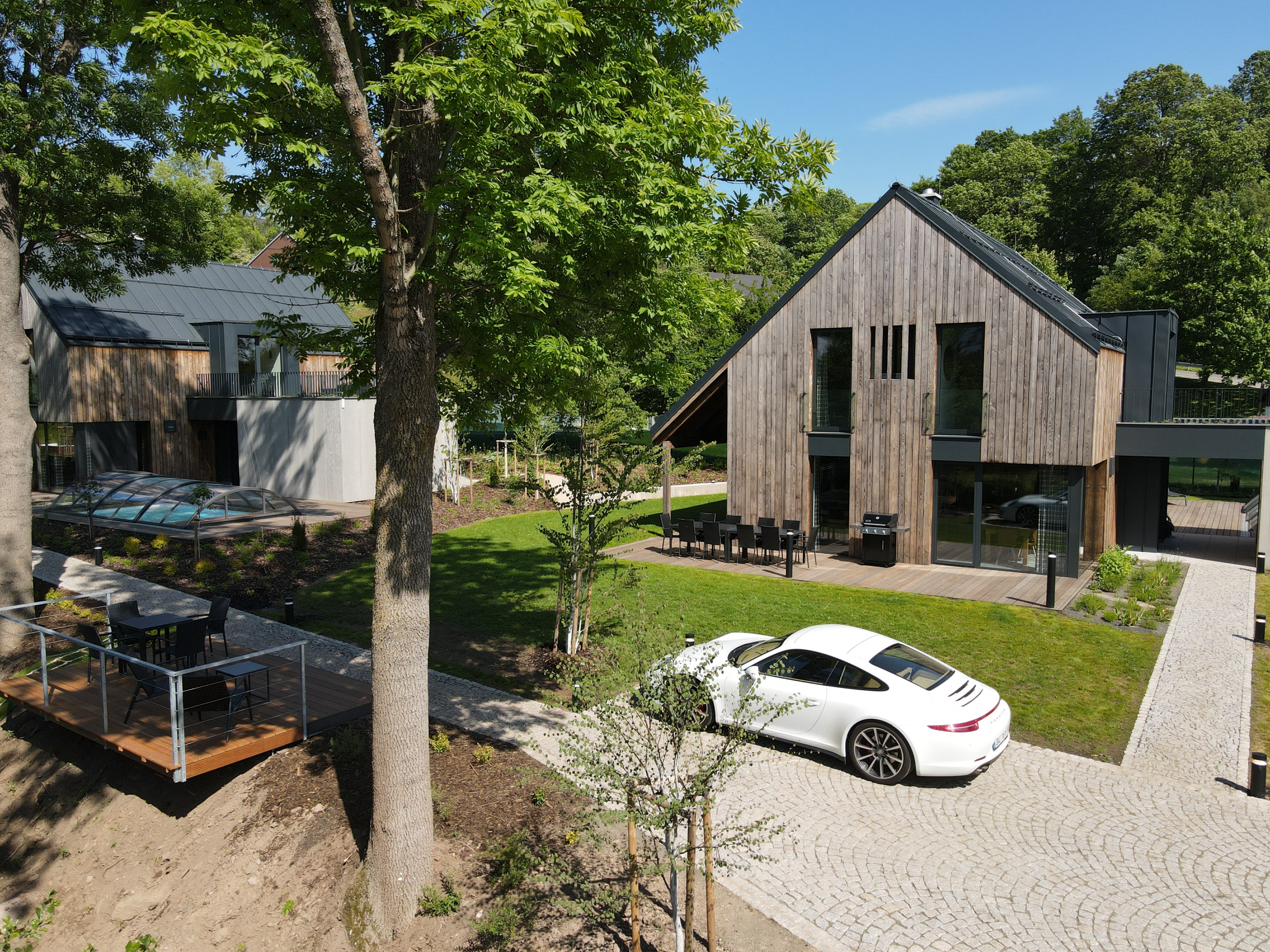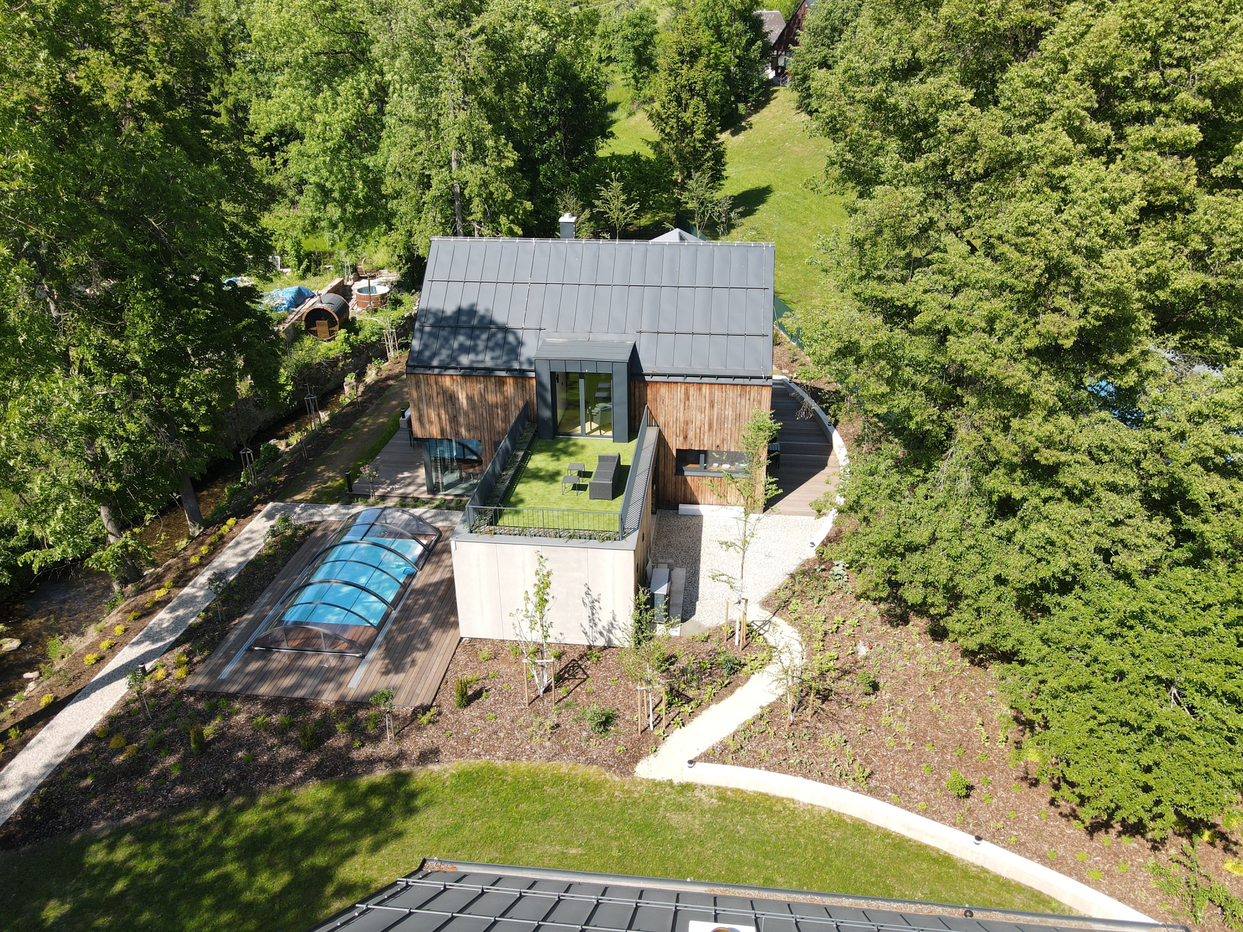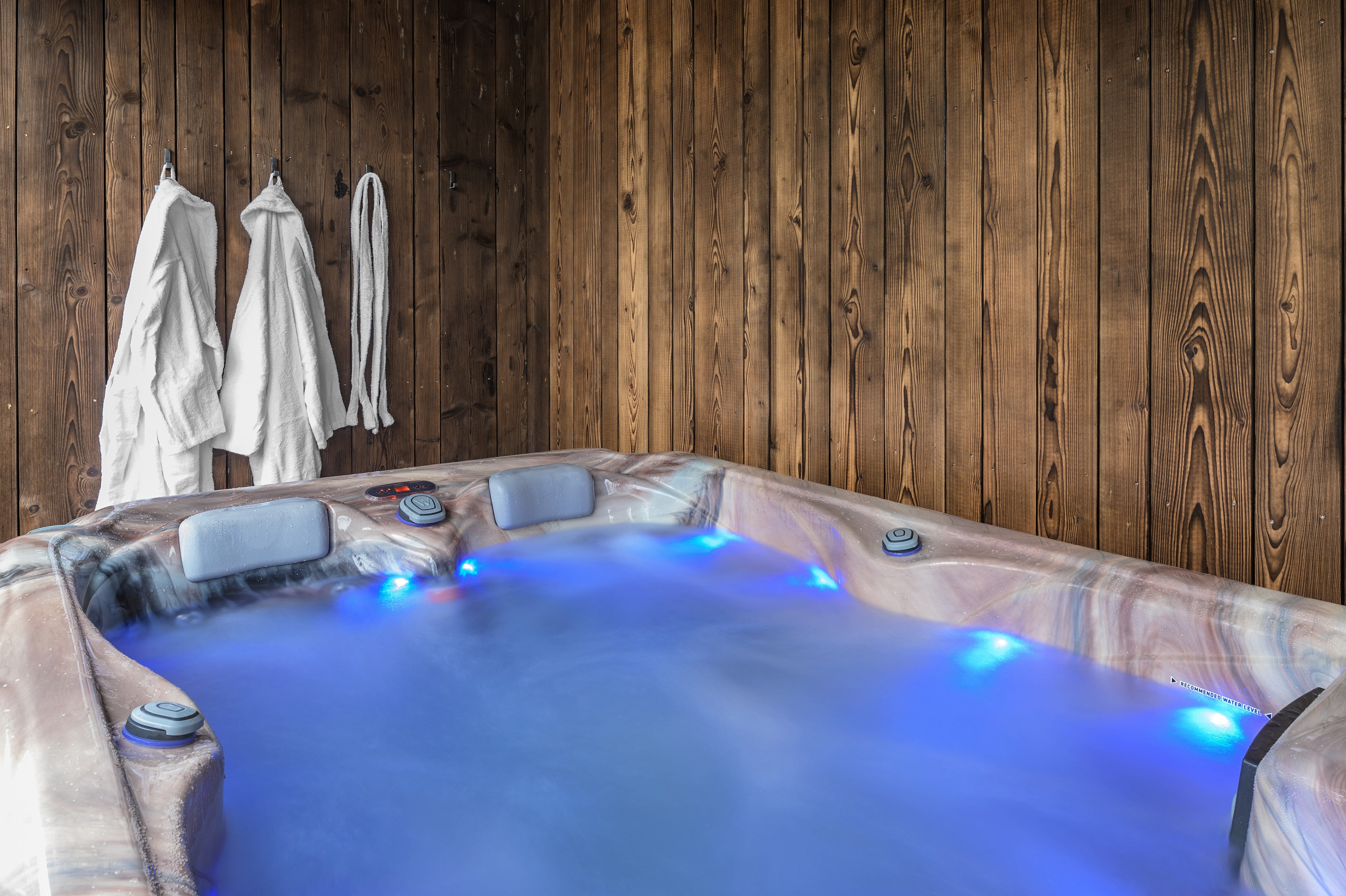 Auch draußen lässt es sich wunderbar aushalten. Rund um das Haus gibt es mehrere Terrassen, darunter eine ganz besondere, die um einen großen Baum herum gebaut wurde. Sie schafft eine einzigartige Atmosphäre und angenehmen Schatten im Sommer. Zudem gibt es eine kleinere, gemütliche „Nest“-Terrasse mit Blick auf die Natur, perfekt für einen ruhigen Morgenkaffee oder ein Glas Wein am Abend. Das beheizte Salzwasser-Schwimmbecken kann das ganze Jahr über genutzt werden, und der Hot Tub ist vielleicht das schönste Extra nach einem Tag Wandern oder Skifahren. Für Kinder gibt es viel Platz zum Spielen und Entdecken, und in kurzer Entfernung finden Sie ein Sportfeld zum Tennis-, Volleyball- oder Mini-Fußballspielen.