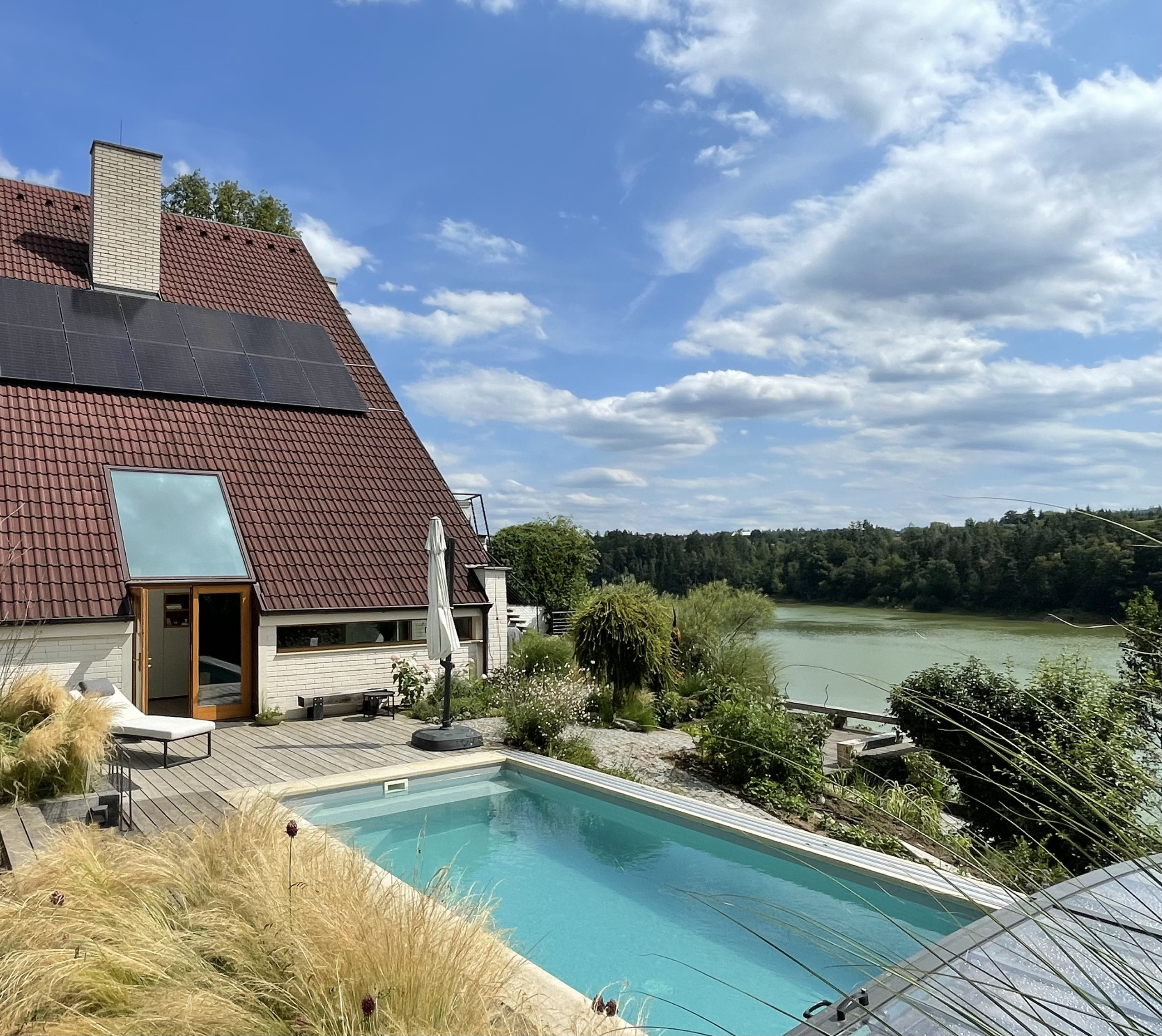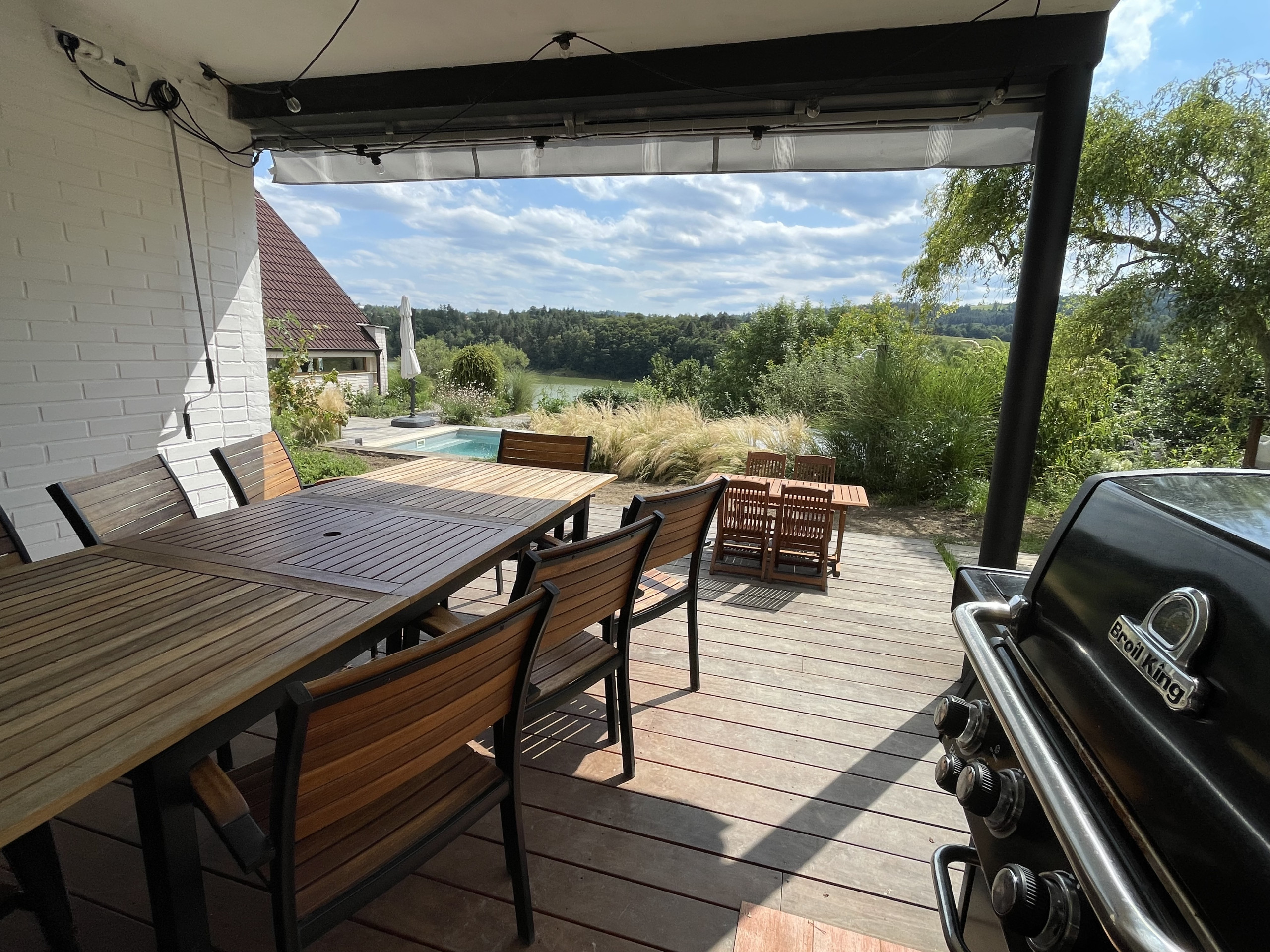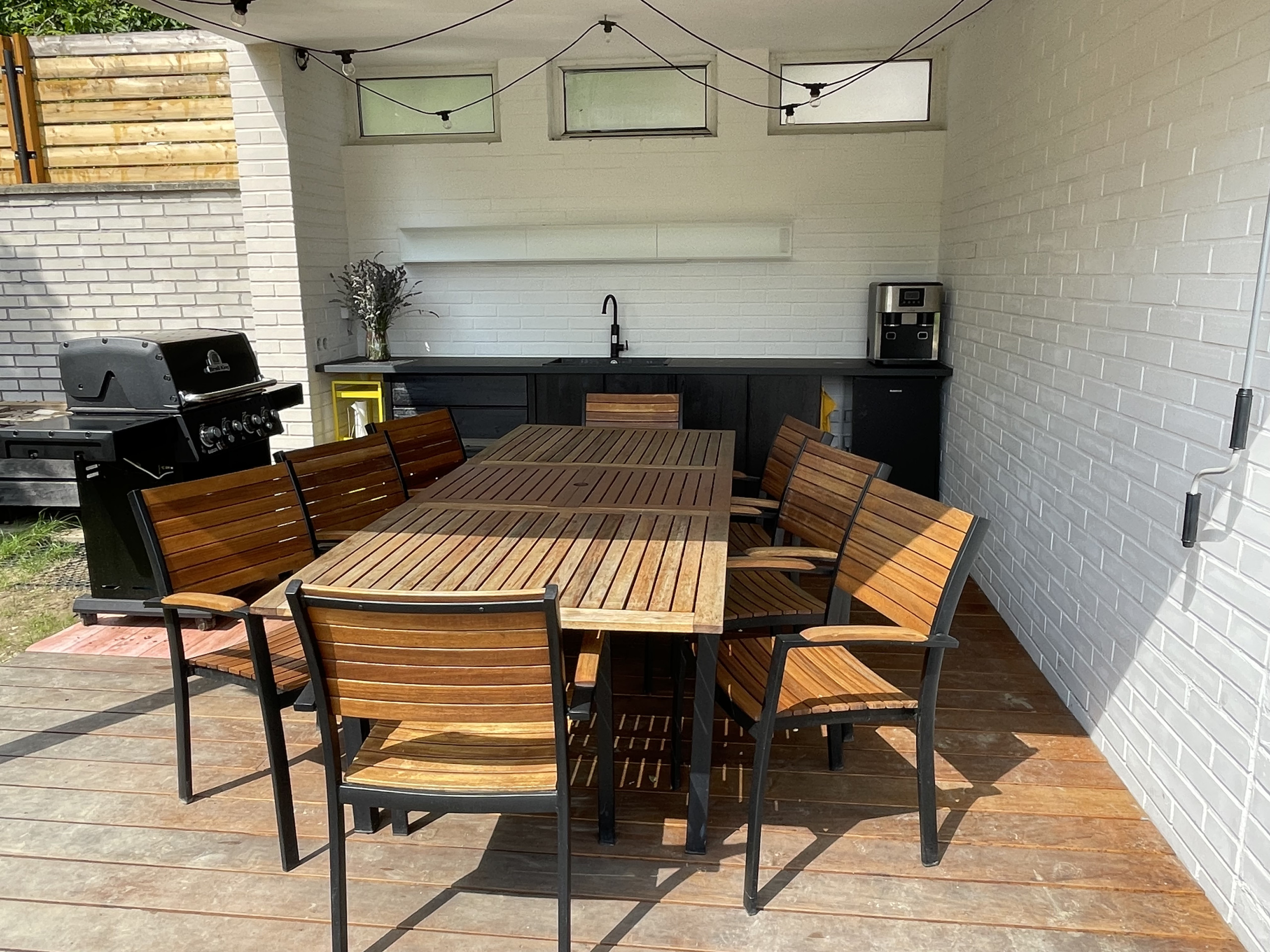 Draußen ist es mindestens genauso schön. Auf der großen Terrasse mit Sommerküche genießen Sie den Blick über den Garten und das Wasser. Perfekt für ein entspanntes Frühstück oder ein Glas Wein bei Sonnenuntergang. Die Kinder können sich auf dem Trampolin, am Klettergerüst oder mit Pfeil und Bogen austoben, während Sie einfach mal die Seele baumeln lassen. Außerdem steht Ihnen ein überdachtes, beheiztes Salzwasser-Schwimmbad zur Verfügung. Ein schöner Steg ist ebenfalls vorhanden, und es besteht die Möglichkeit, SUPs (Stand-up-Paddleboards) zu mieten, um noch mehr Wasserspaß zu erleben.