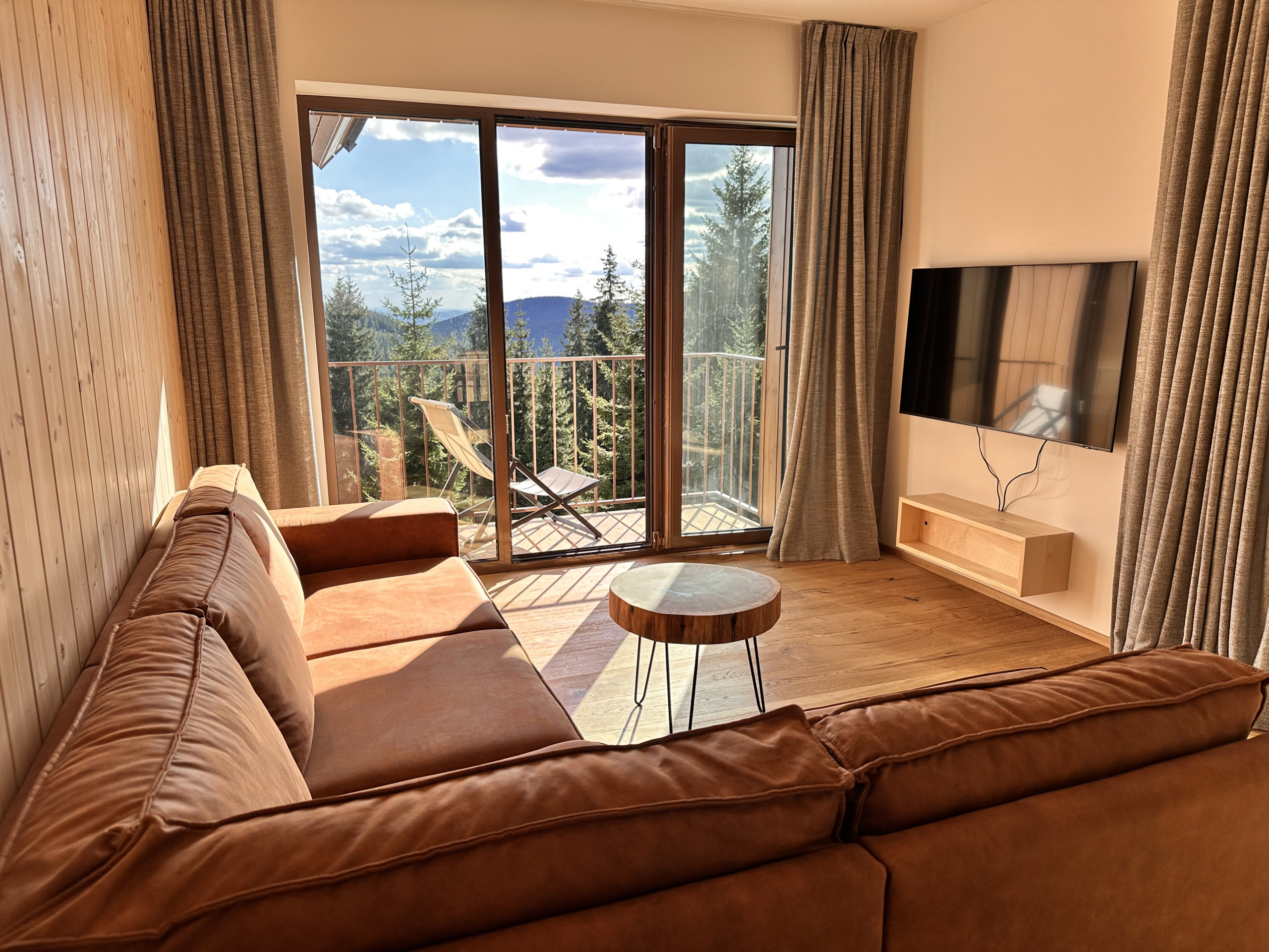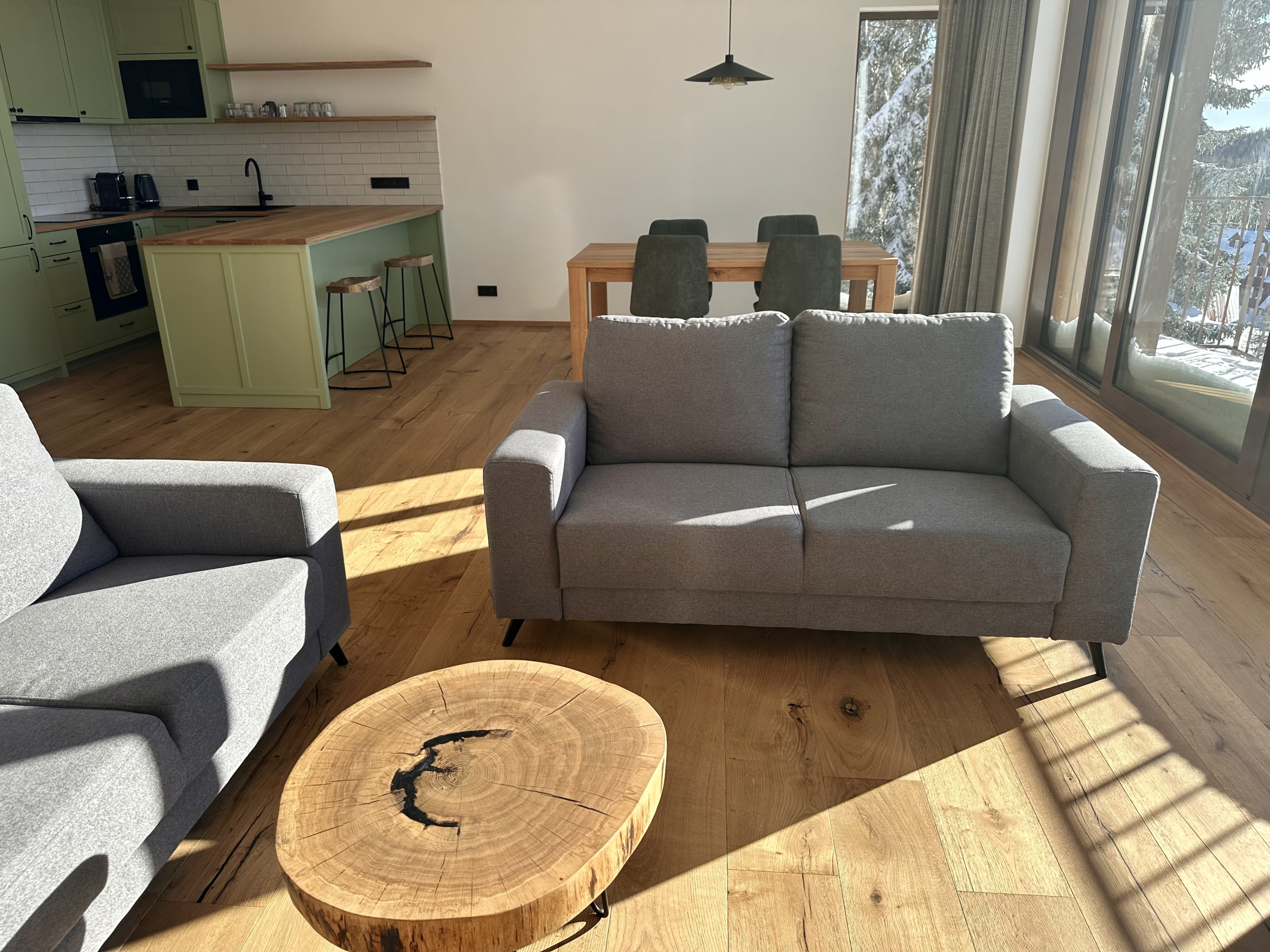 Jedes Apartment ist hell, großzügig und stilvoll eingerichtet, mit großen Fenstern und einem Balkon mit Blick auf die Berge. Ihnen steht überall eine voll ausgestattete Küche mit Backofen, Geschirrspüler und Nespresso-Kaffeemaschine, ein großer Esstisch sowie ein gemütlicher Wohnbereich zur Verfügung.