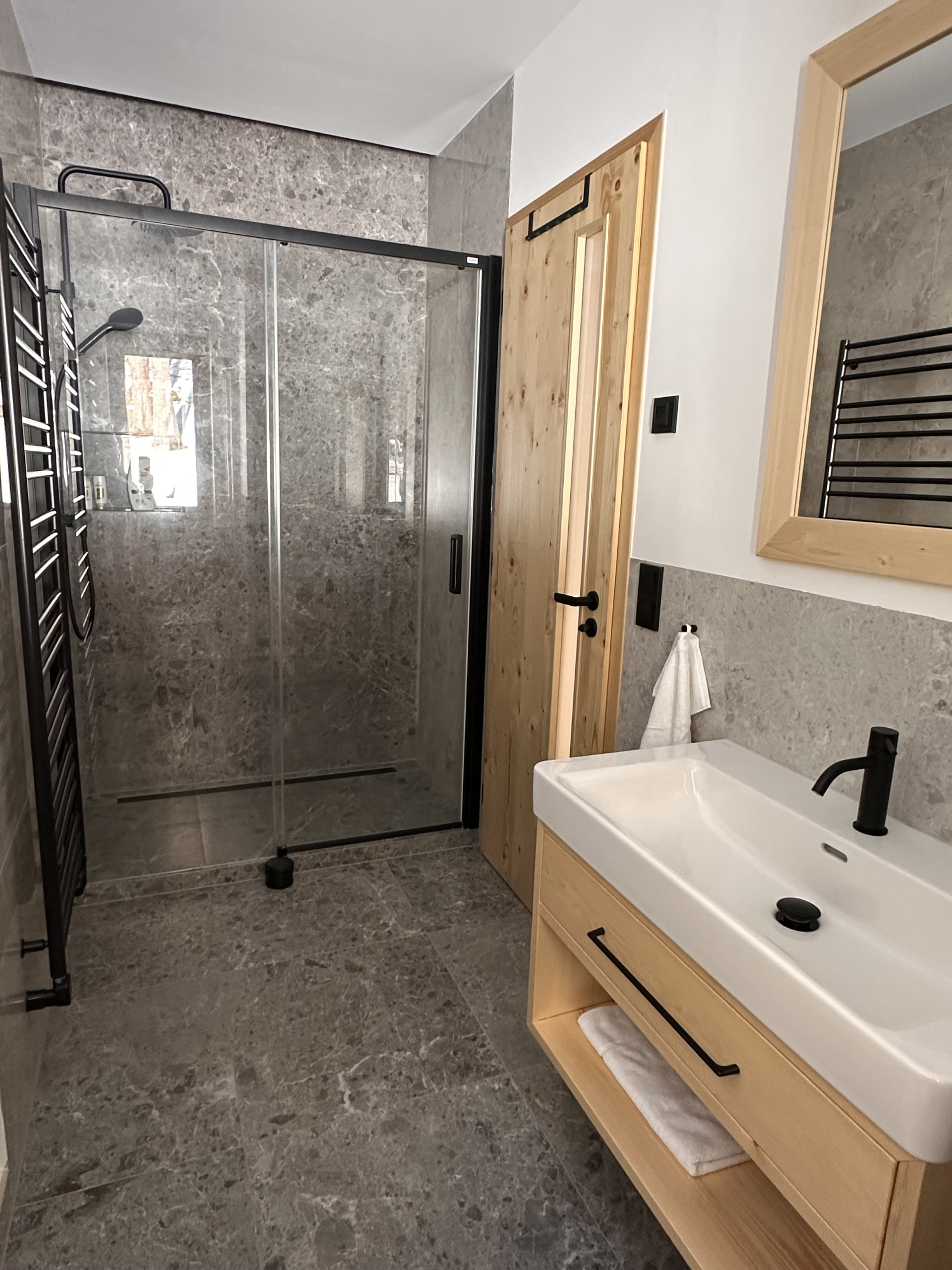 Jedes Apartment verfügt über ein eigenes Badezimmer mit Dusche und WC sowie ein zusätzliches separates WC, was den Aufenthalt mit größeren Gruppen besonders angenehm macht.